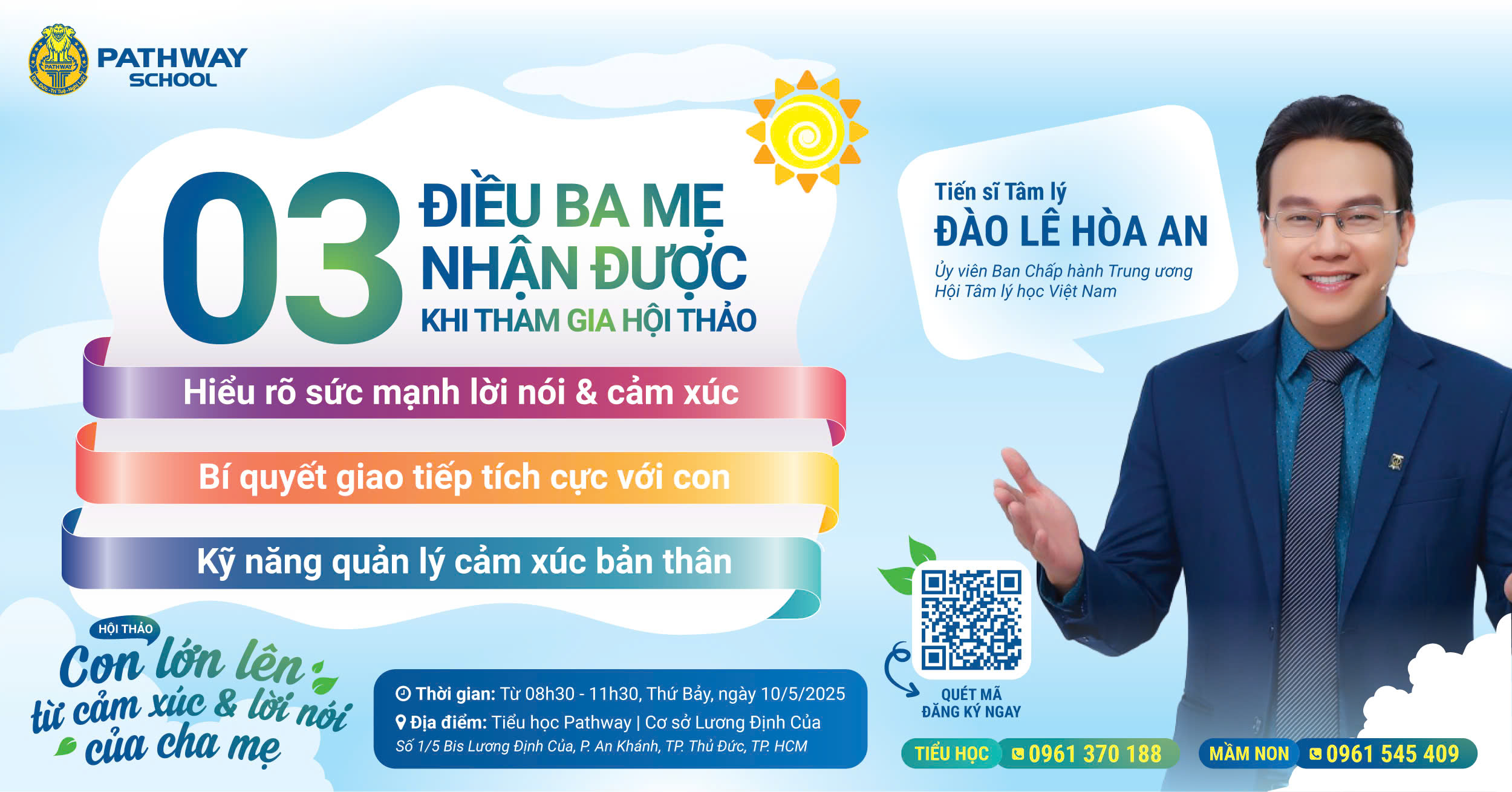 Thấu hiểu điều đó, Pathway School kính mời quý phụ huynh đến tham dự buổi hội thảo giáo dục chuyên sâu được dẫn dắt bởi Tiến sĩ tâm lý Đào Lê Hoà An “Con lớn lên từ cảm xúc và lời nói của cha mẹ”. Tại đây, ba mẹ sẽ được: