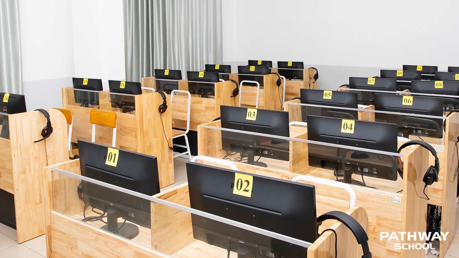 Không gian học tập công nghệ với hệ thống máy tính đồng bộ, hỗ trợ học sinh phát triển kỹ năng số và tư duy logic trong thời đại số.