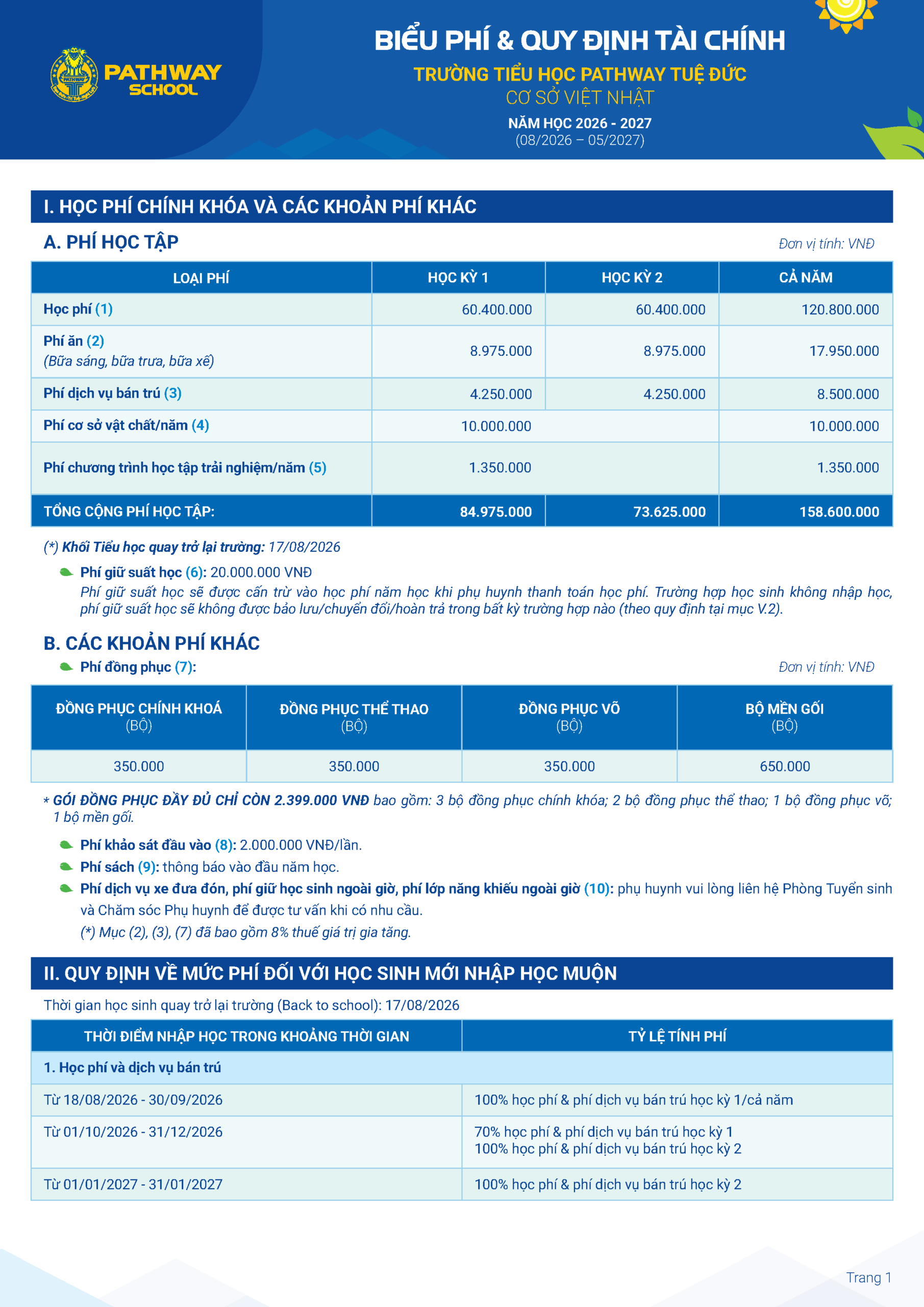 BIỂU PHÍ VÀ QUY ĐỊNH TÀI CHÍNH NĂM HỌC 2026 – 2027