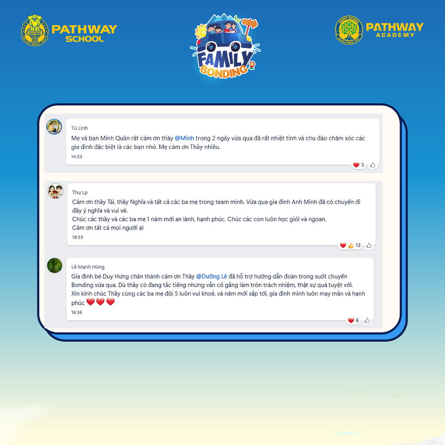 Hành trình Family Bonding khép lại, nhưng điều ở lại lâu nhất không chỉ là những kỷ niệm đẹp, mà là những lời chia sẻ chân thành từ ba mẹ gửi về cho Nhà trường. Trong từng tin nhắn, Pathway cảm nhận rõ sự tin tưởng, yêu thương và niềm biết ơn mà các gia đình dành cho chương trình và đội ngũ thầy cô.