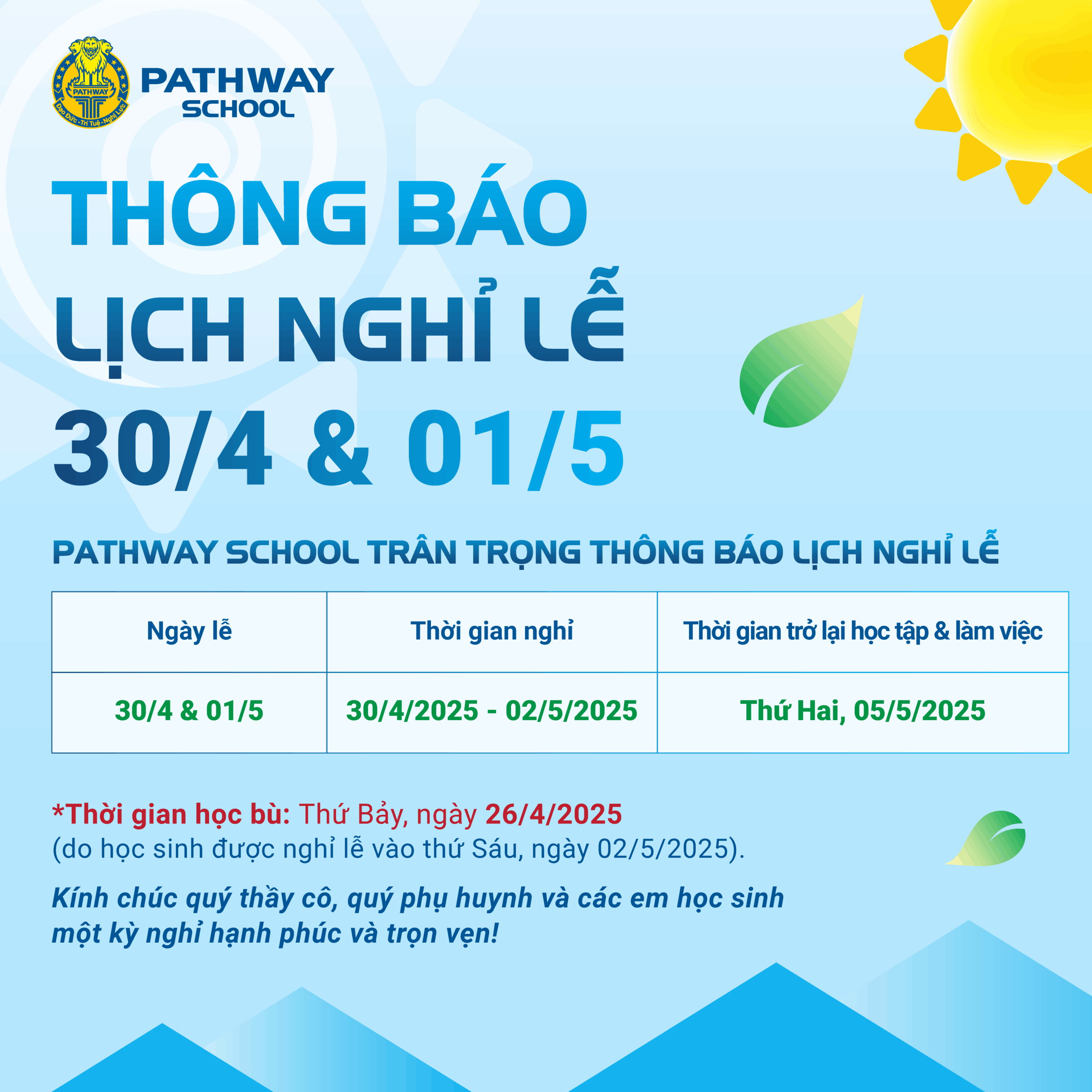 Pathway School trân trọng thông báo lịch nghỉ lễ 30/4 và 01/5 như sau: