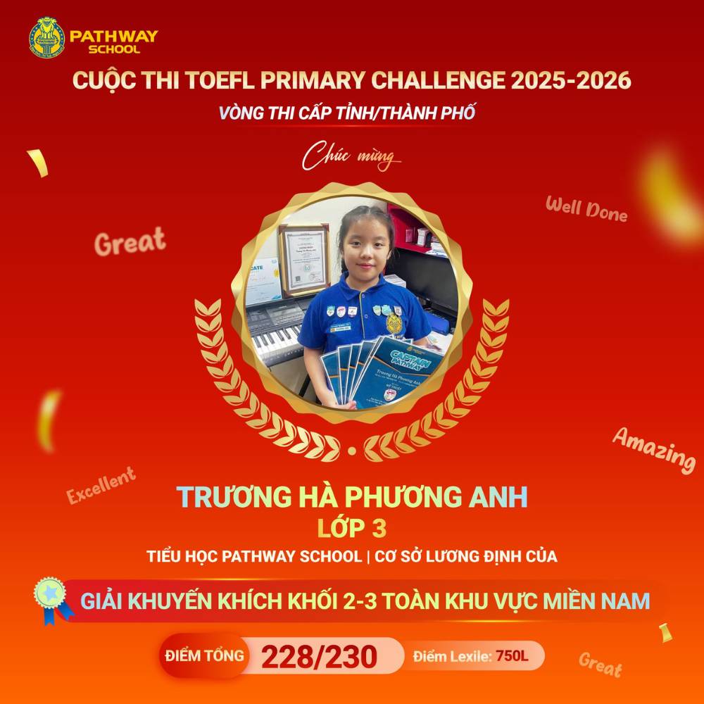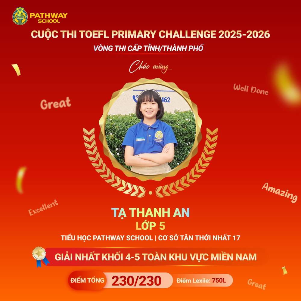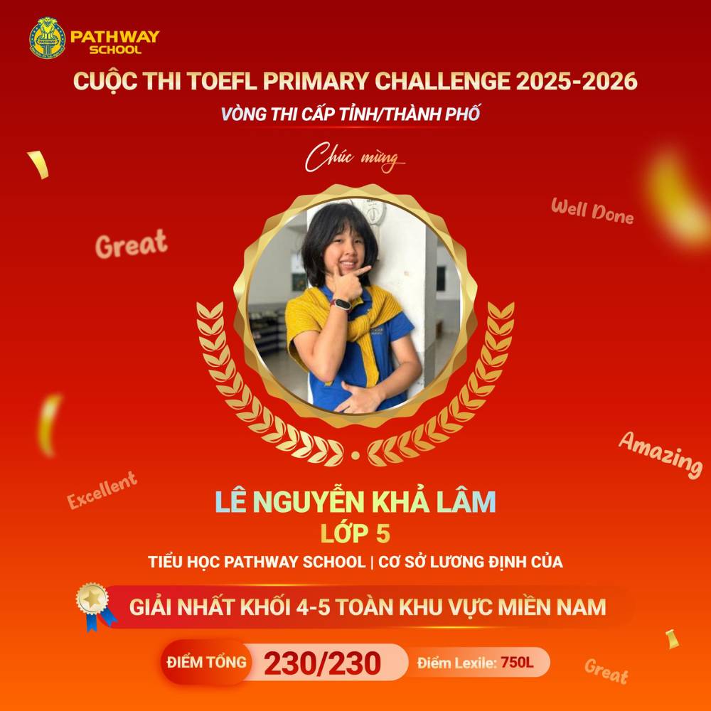 HỌC SINH PATHWAY SCHOOL XUẤT SẮC GIÀNH 2 GIẢI NHẤT TOÀN KHU VỰC MIỀN NAM với số điểm tuyệt đối tại Vòng thi cấp Tỉnh/Thành phố – Cuộc thi TOEFL Primary Challenge 2025–2026.