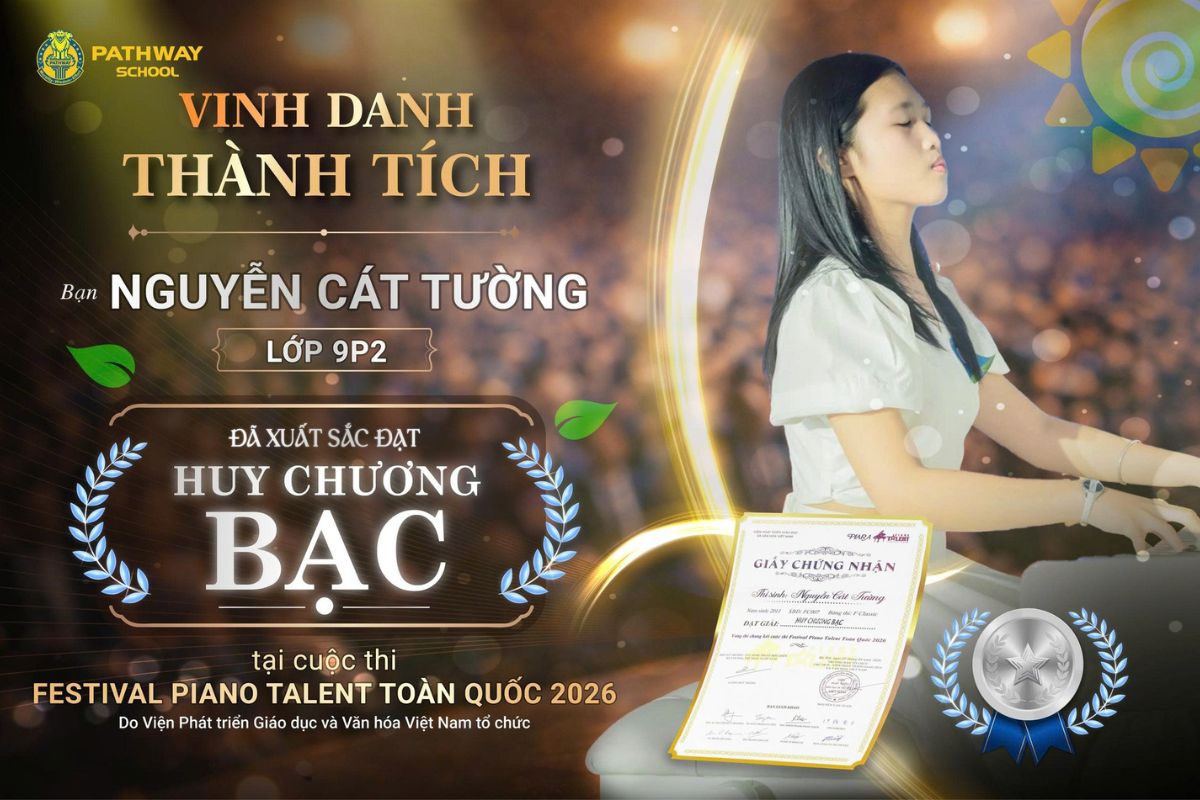 Tại cuộc thi Festival Piano Talent Toàn Quốc 2026, xin chúc mừng bạn Nguyễn Cát Tường (9P2) đã xuất sắc đạt Huy chương Bạc – Bảng F Classic tại vòng Chung kết. Đây là bảng thi thuộc hệ Classical với yêu cầu cao về kỹ thuật và cảm thụ âm nhạc, quy tụ nhiều thí sinh có nền tảng vững vàng.