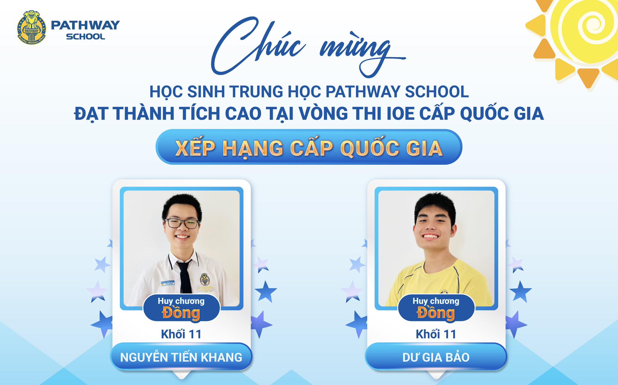 Đặc biệt chúc mừng bạn Nguyễn Tiến Khang và bạn Dư Gia Bảo, học sinh lớp 11, Trung học Pathway School, Chi nhánh Lê Thị Riêng đã xuất sắc chinh phục giải Đồng, cấp Quốc gia. Đây là minh chứng rõ nét cho hành trình học tập nghiêm túc, nỗ lực và kỷ luật của các em suốt thời gian qua.