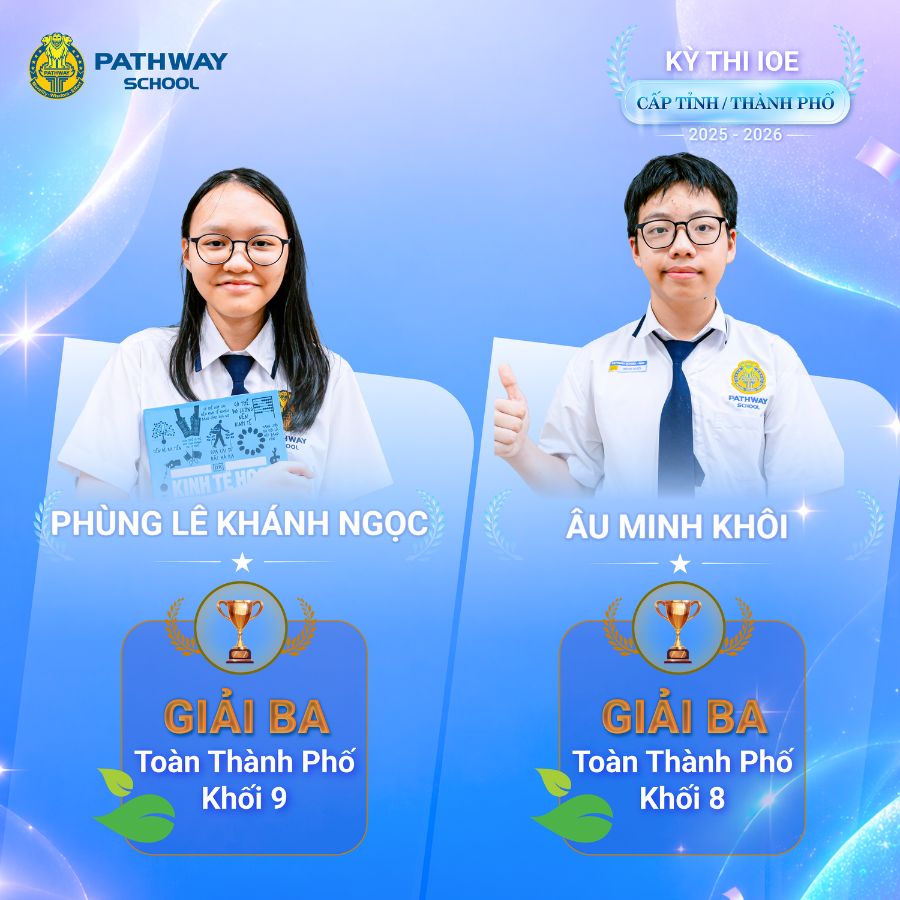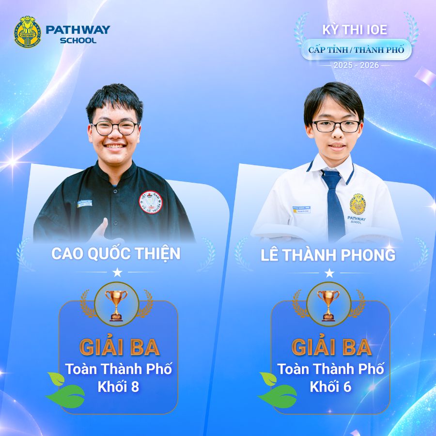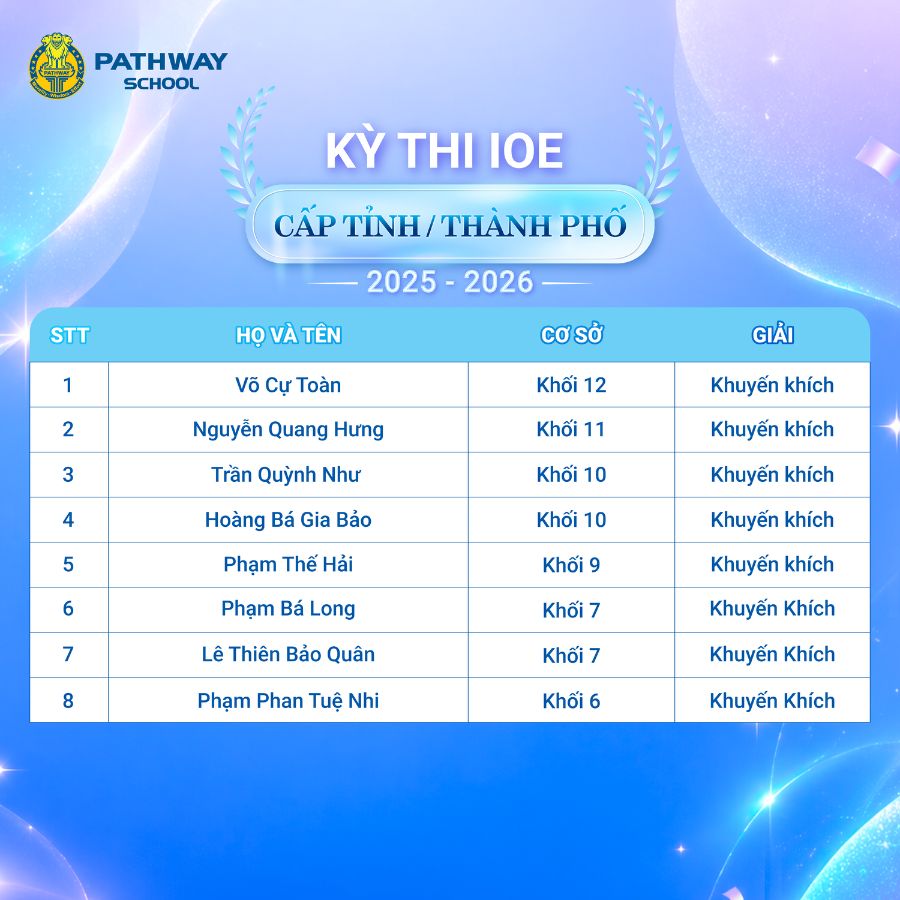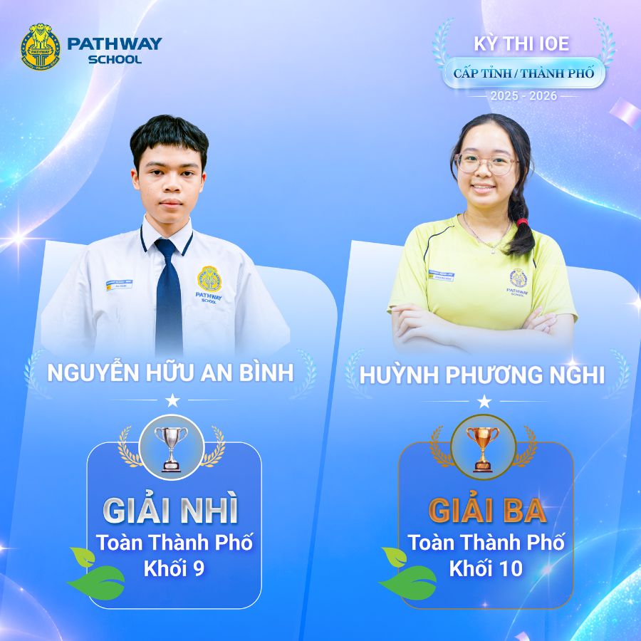 Tại vòng thi IOE cấp Tỉnh/Thành phố năm học 2025–2026, học sinh Trung học Pathway School – Cơ sở Nguyễn Sỹ Sách đã đạt được nhiều kết quả đáng ghi nhận, thể hiện sự nỗ lực và tinh thần học tập nghiêm túc trong suốt quá trình ôn luyện.